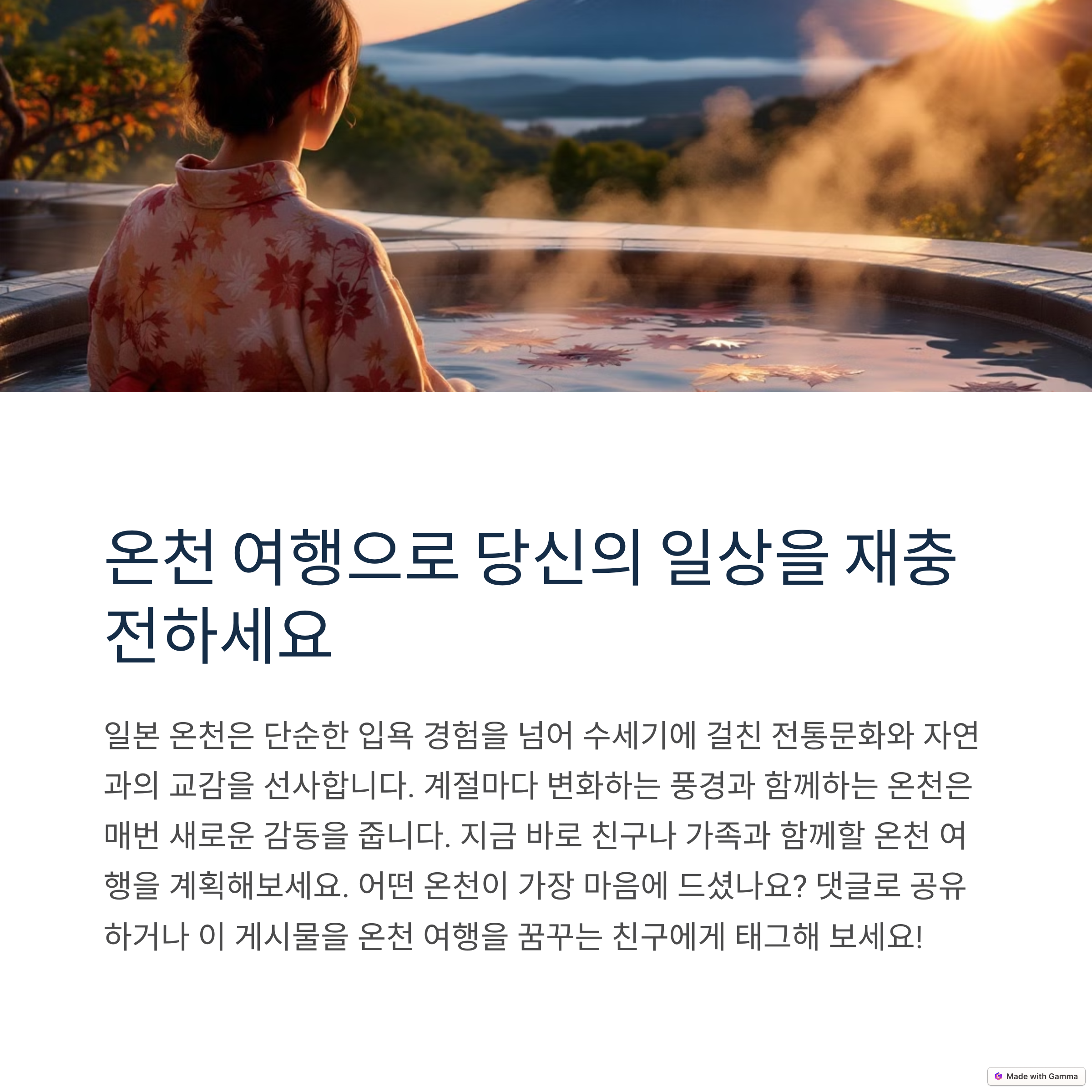 오늘은 따뜻하고 힐링 가득한 2024 일본 온천여행에 대해 소개합니다.