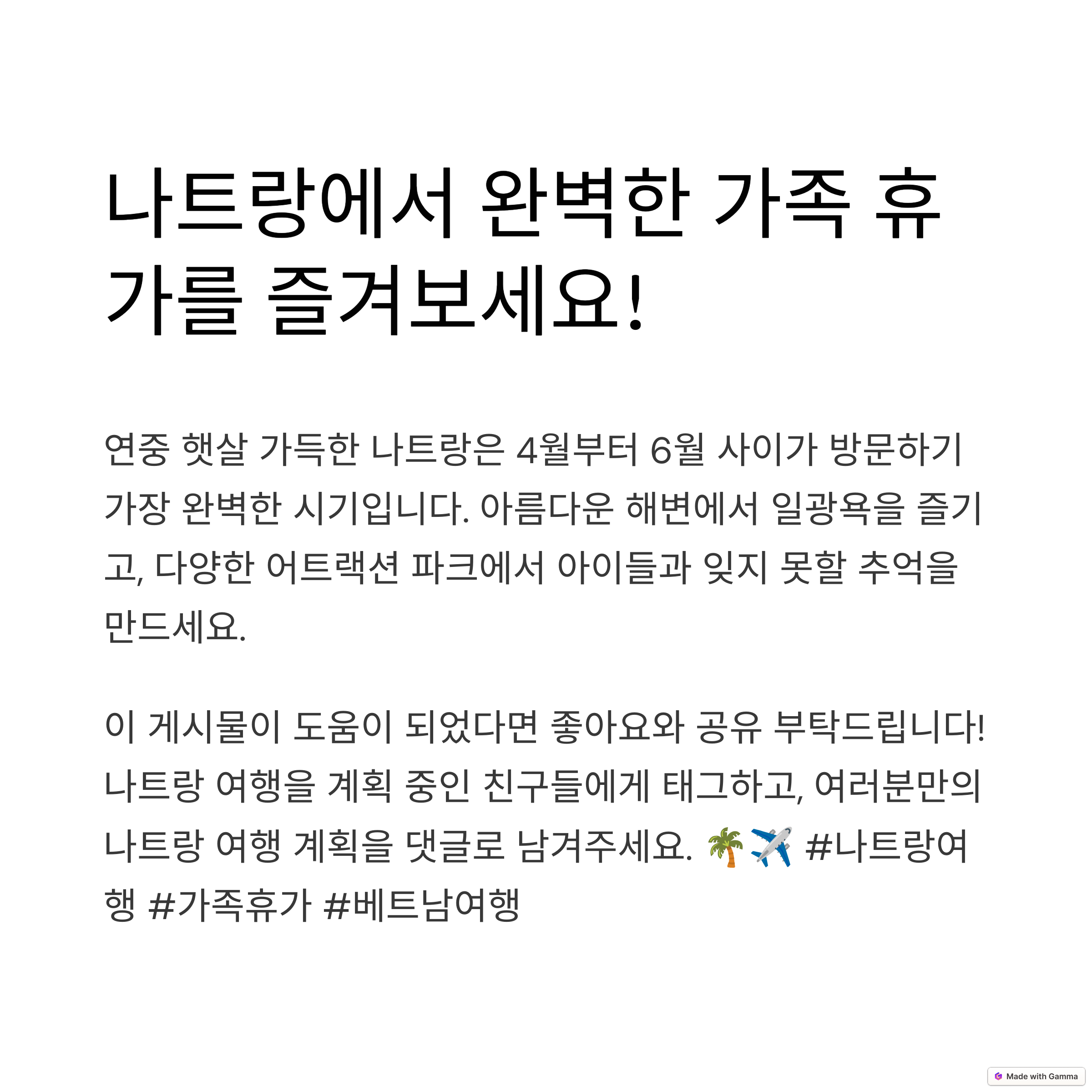 나트랑은 가족 휴가를 위한 최고의 휴양지 중 하나이며, 자연과 함께 특별한 이야기를 만들어 나가기 좋은 곳입니다.