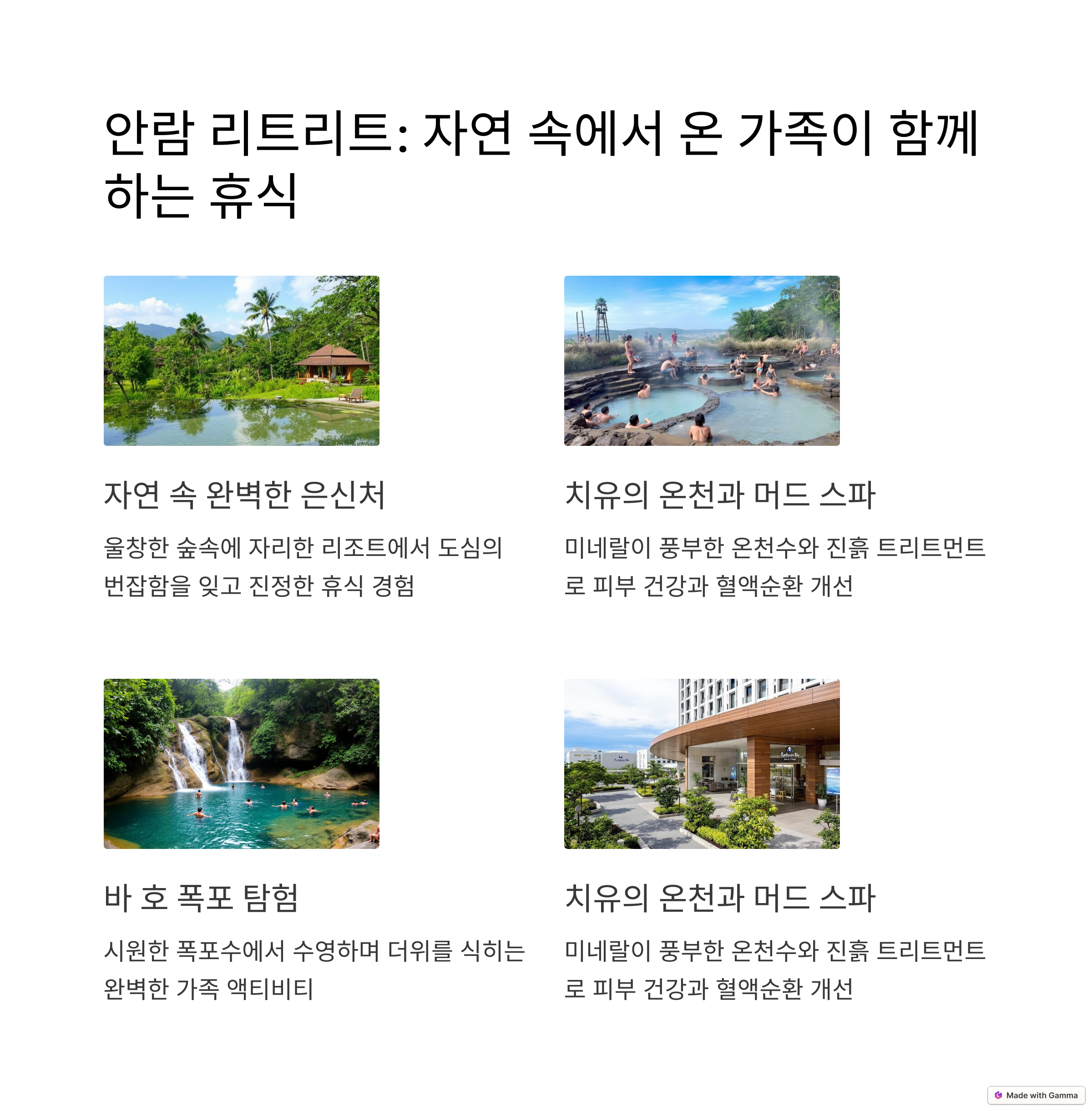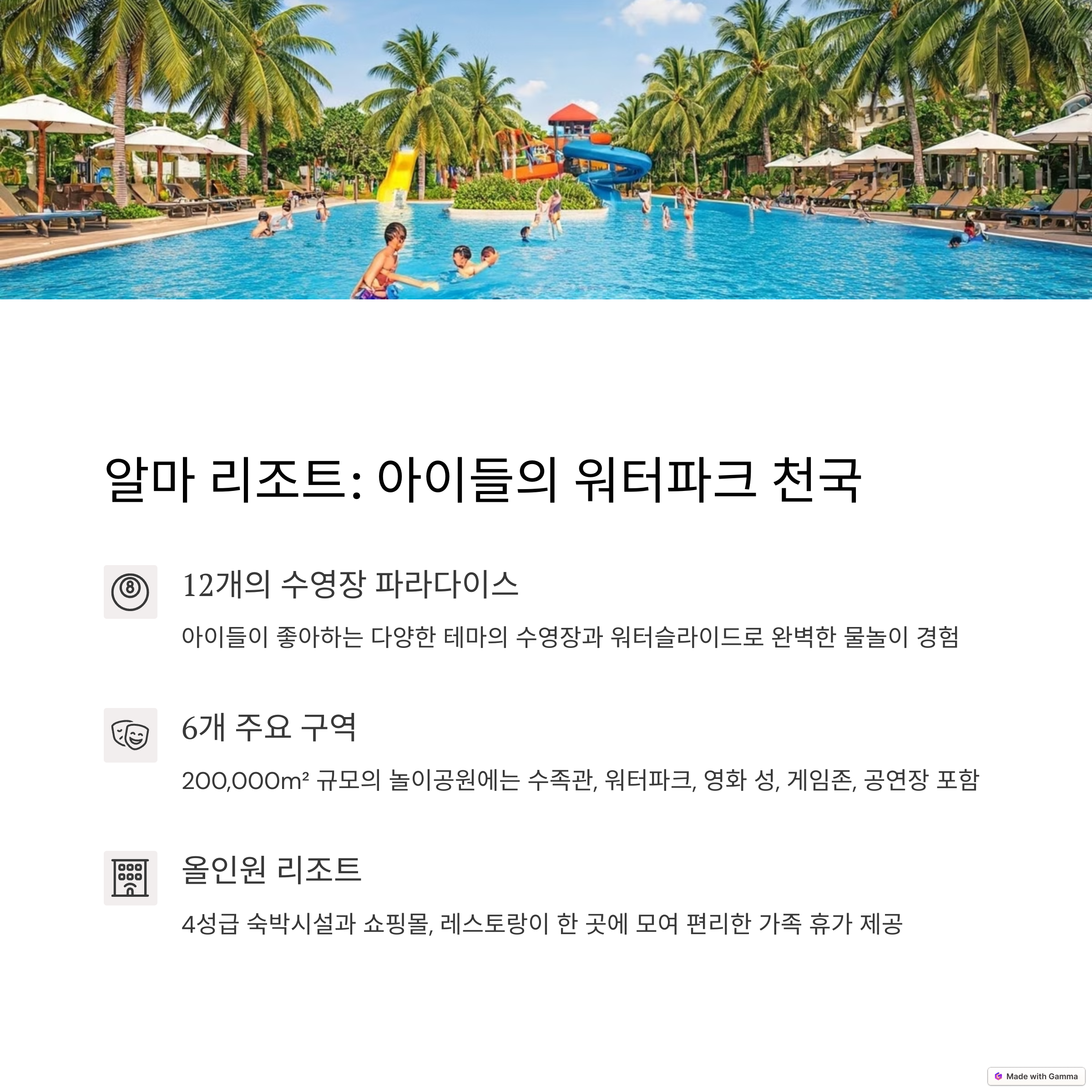워터파크와 풀빌라는 나트랑 숙소의 큰 강점이며, 가족과의 특별한 추억을 쌓기에 최적의 환경을 제공합니다.