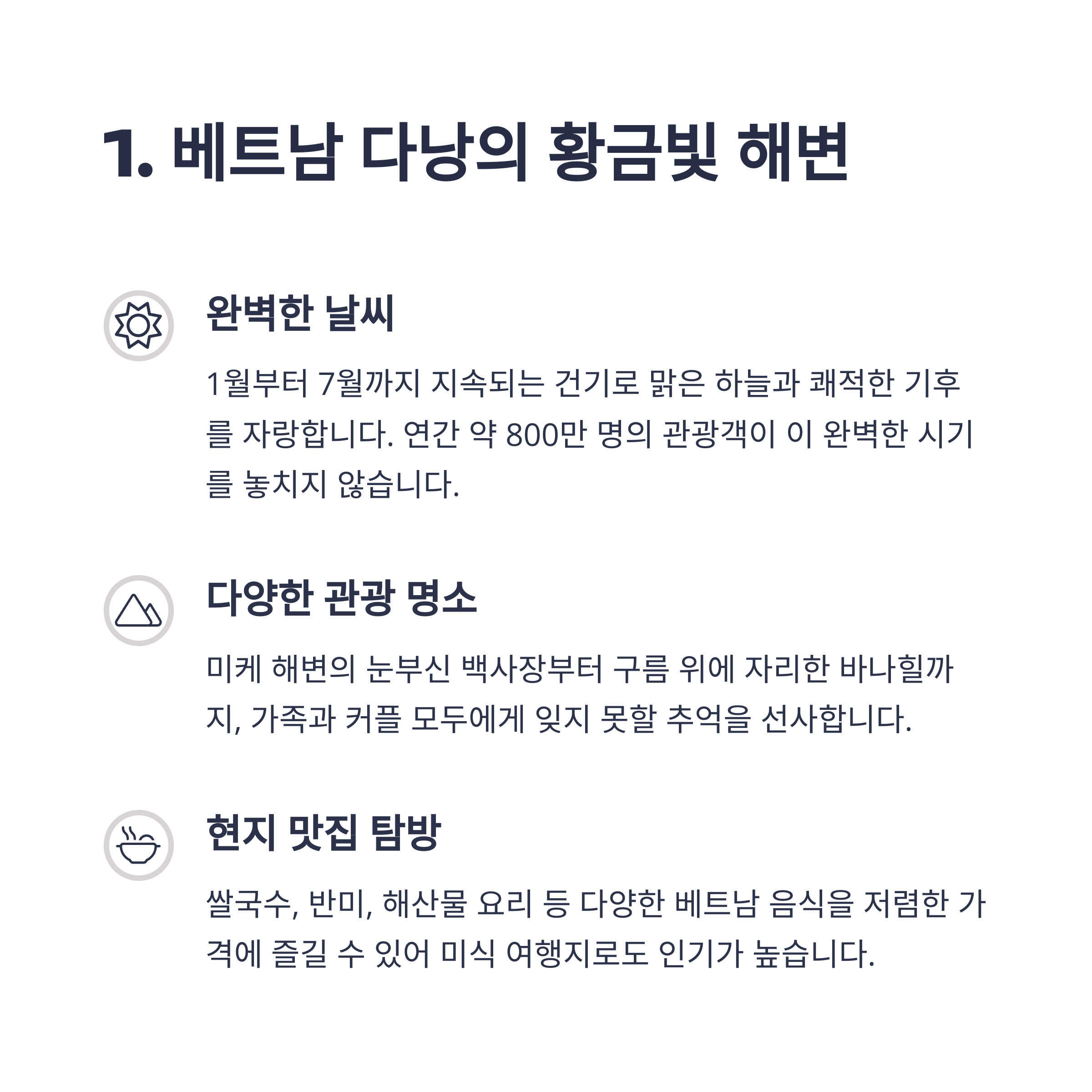1. 베트남 다낭은 아름다운 미케 비치와 활기찬 도시 분위기로 특히 여름 시즌에 사랑받는 여행지입니다.