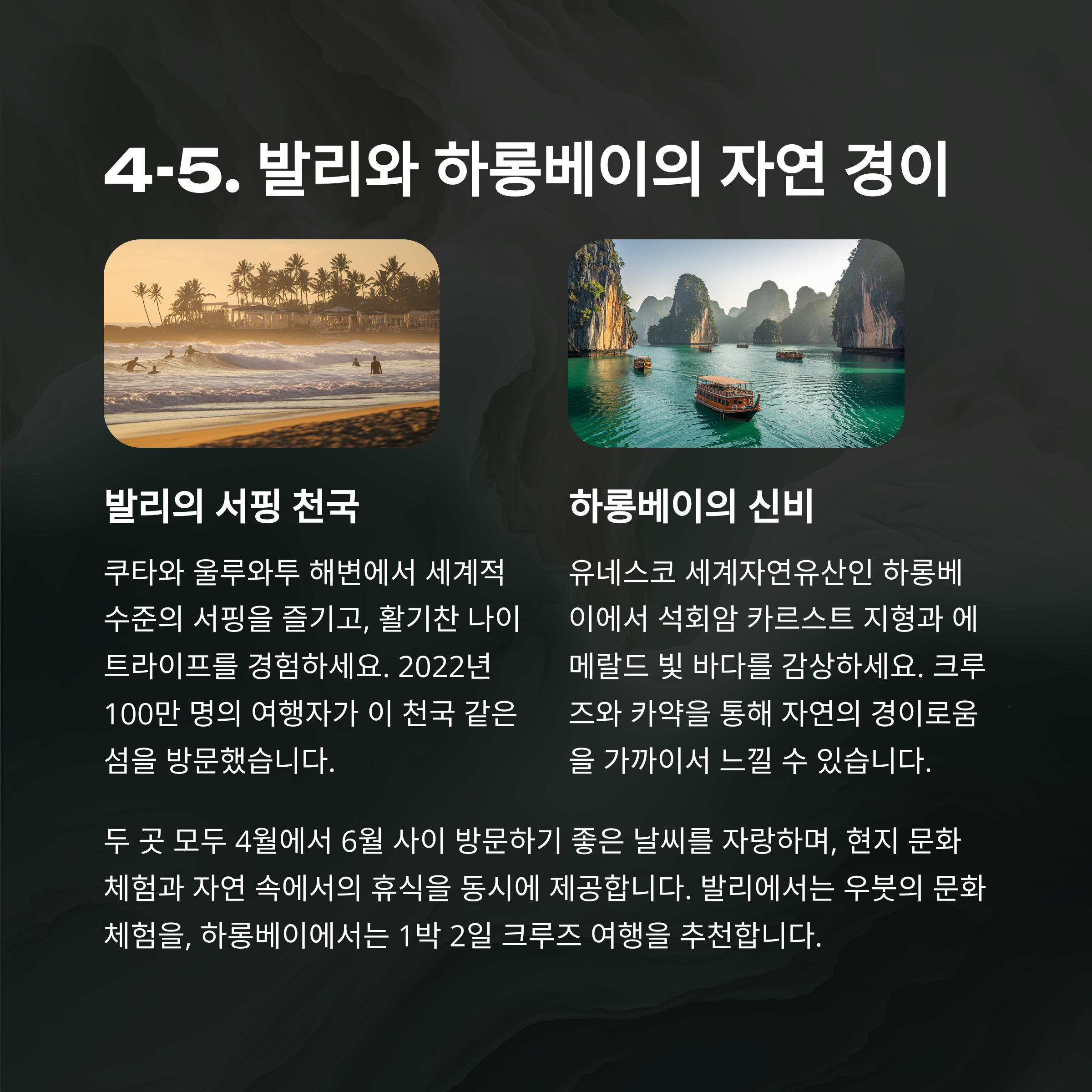 특히, 해변 및 야외 활동이 중요한 다낭이나 발리와 같은 지역은 이 기간 동안 많은 관광객이 찾습니다.