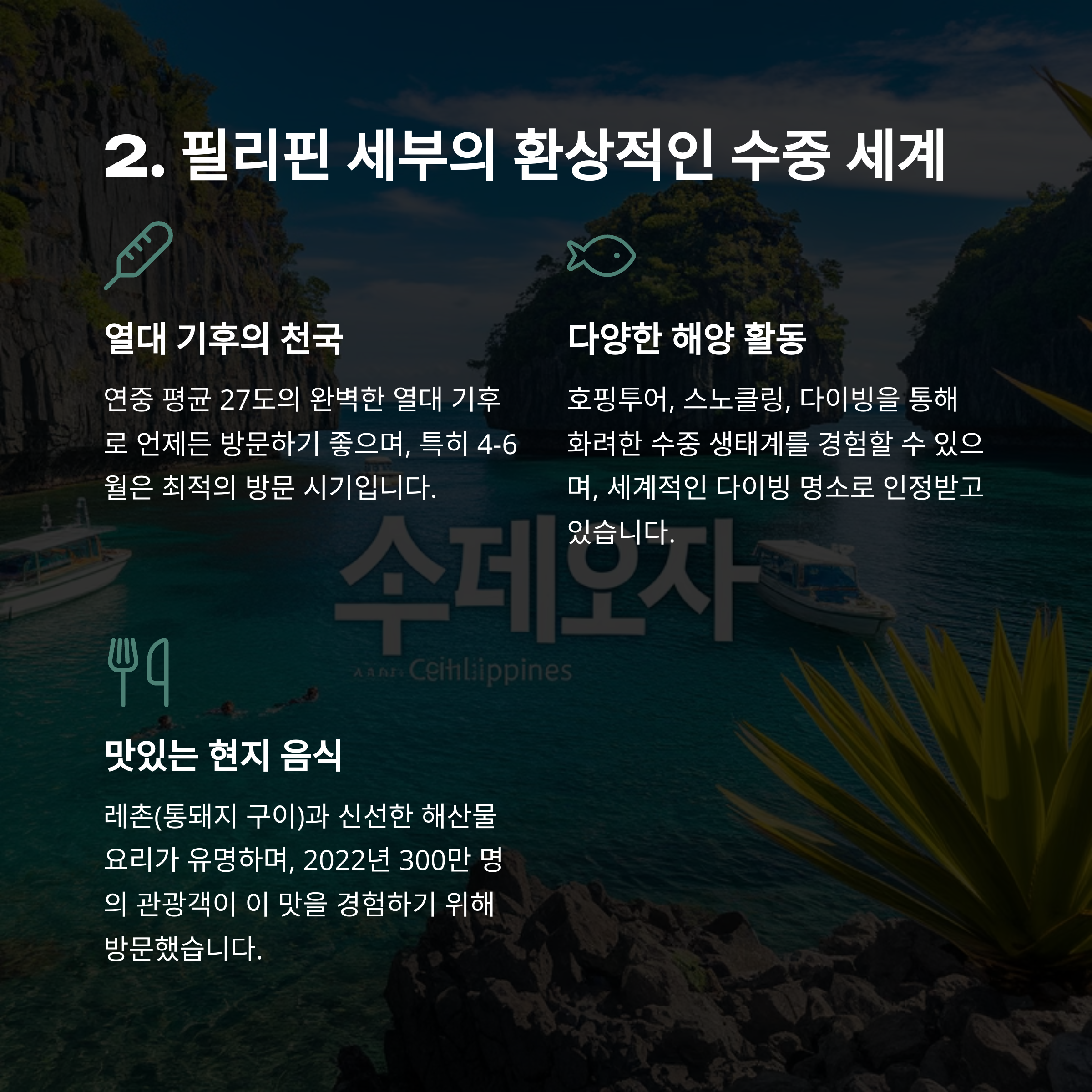 2. 필리핀 세부는 천혜의 자연 환경과 더불어 해양 액티비티를 즐기러 오는 관광객들에게 최적의 장소입니다.
