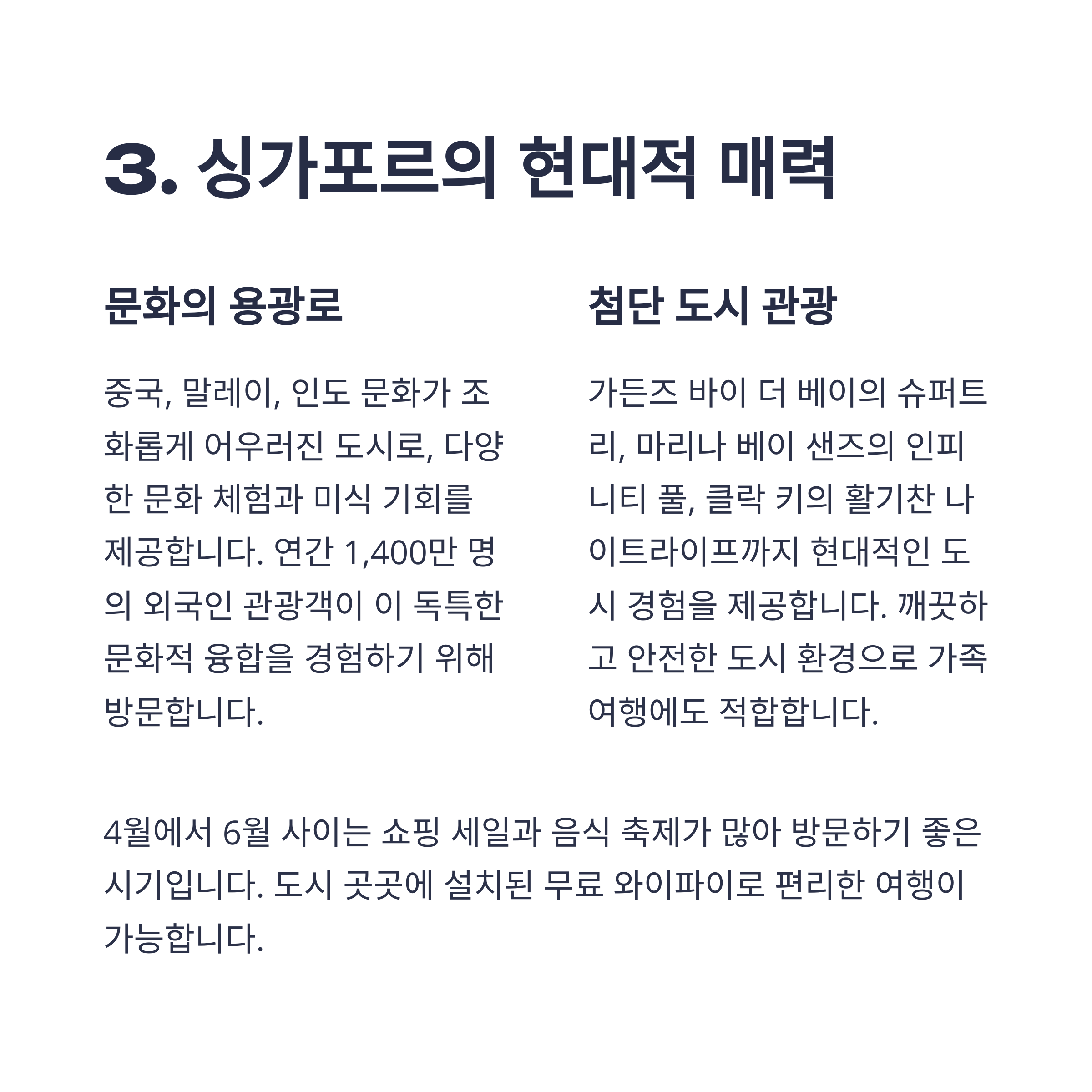3. 싱가포르는 현대적이고 세련된 도시 풍경과 다양한 문화가 어우러진 도시 국가입니다.