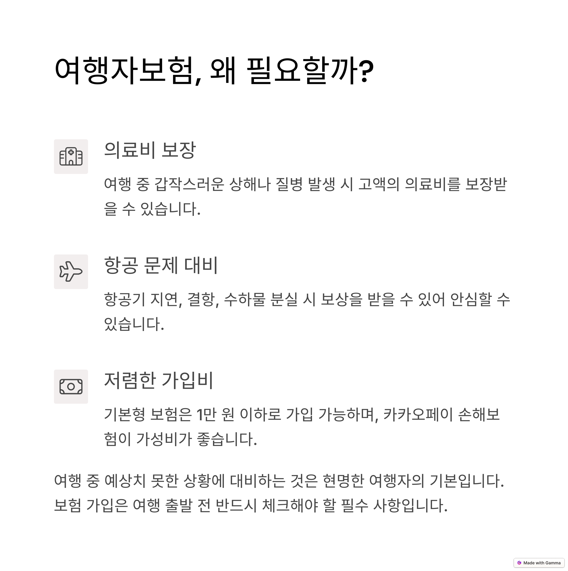 여행자보험은 현지에서 발생할 수 있는 다양한 사고를 대비할 수 있는 필수 도구입니다.